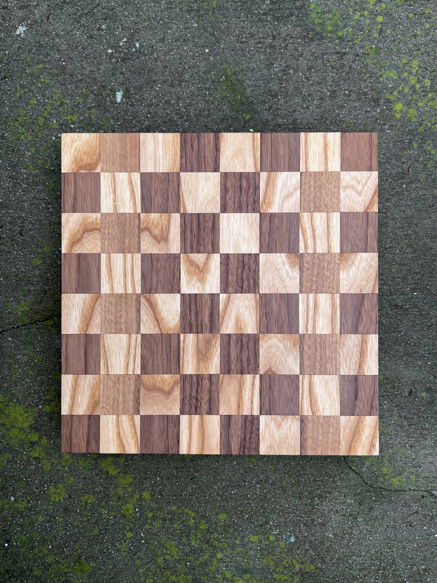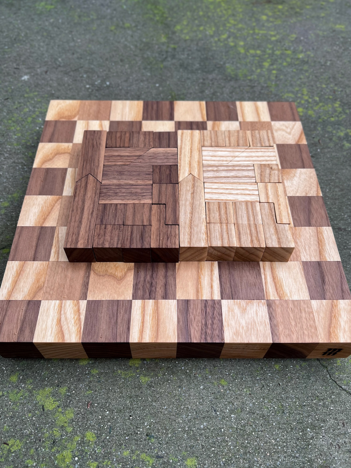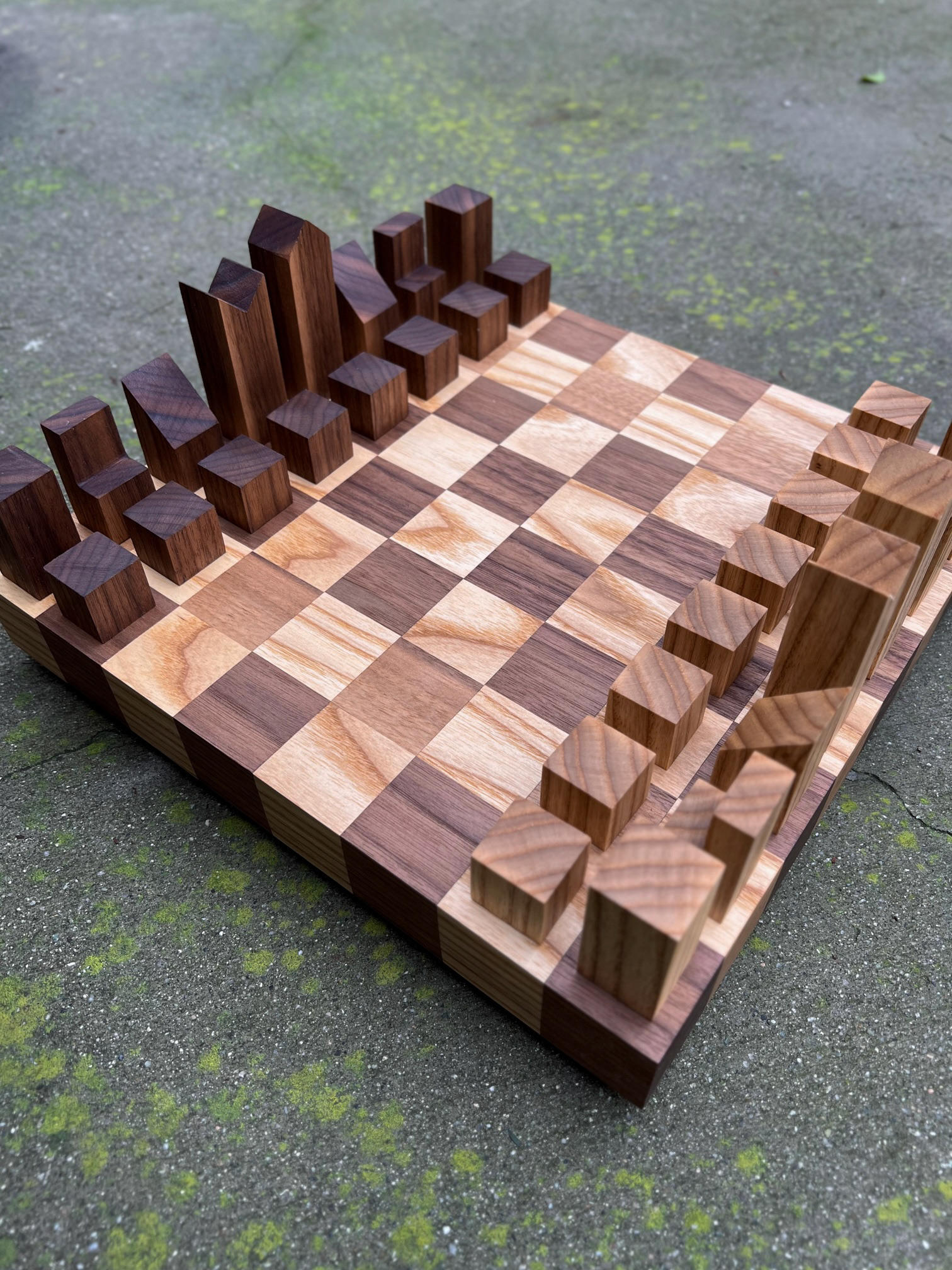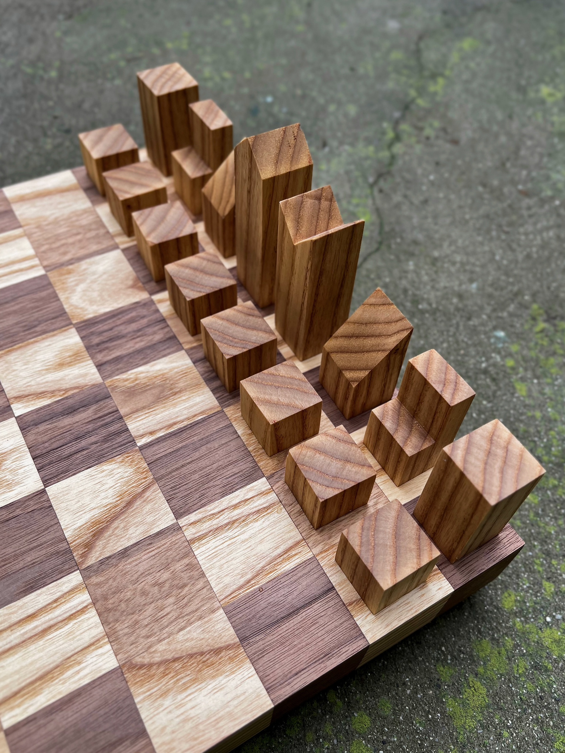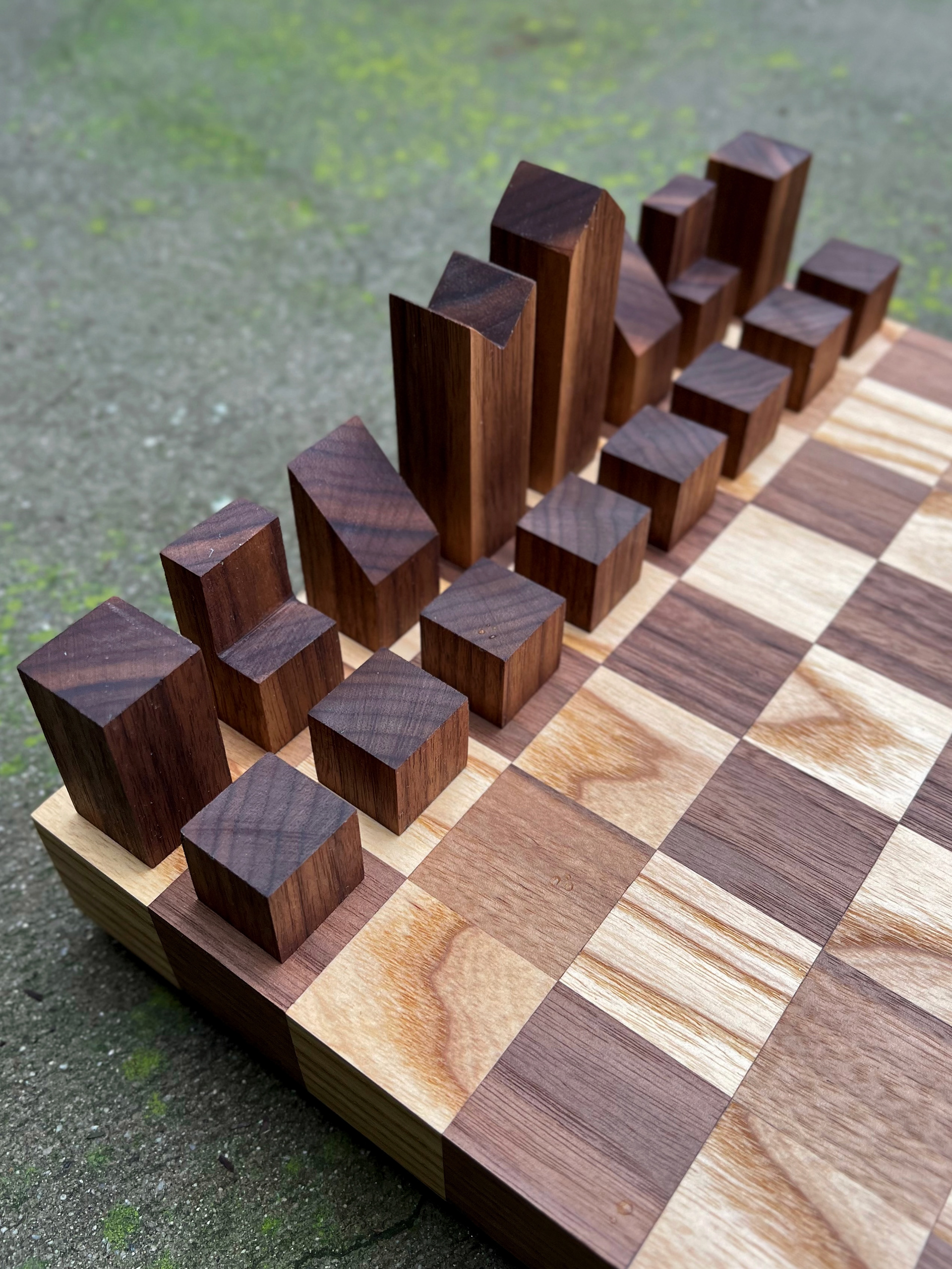WALNUT AND ASH CHESS SET. PIECES MADE AFTER 1967 LANIER GRAHAM DESIGN.