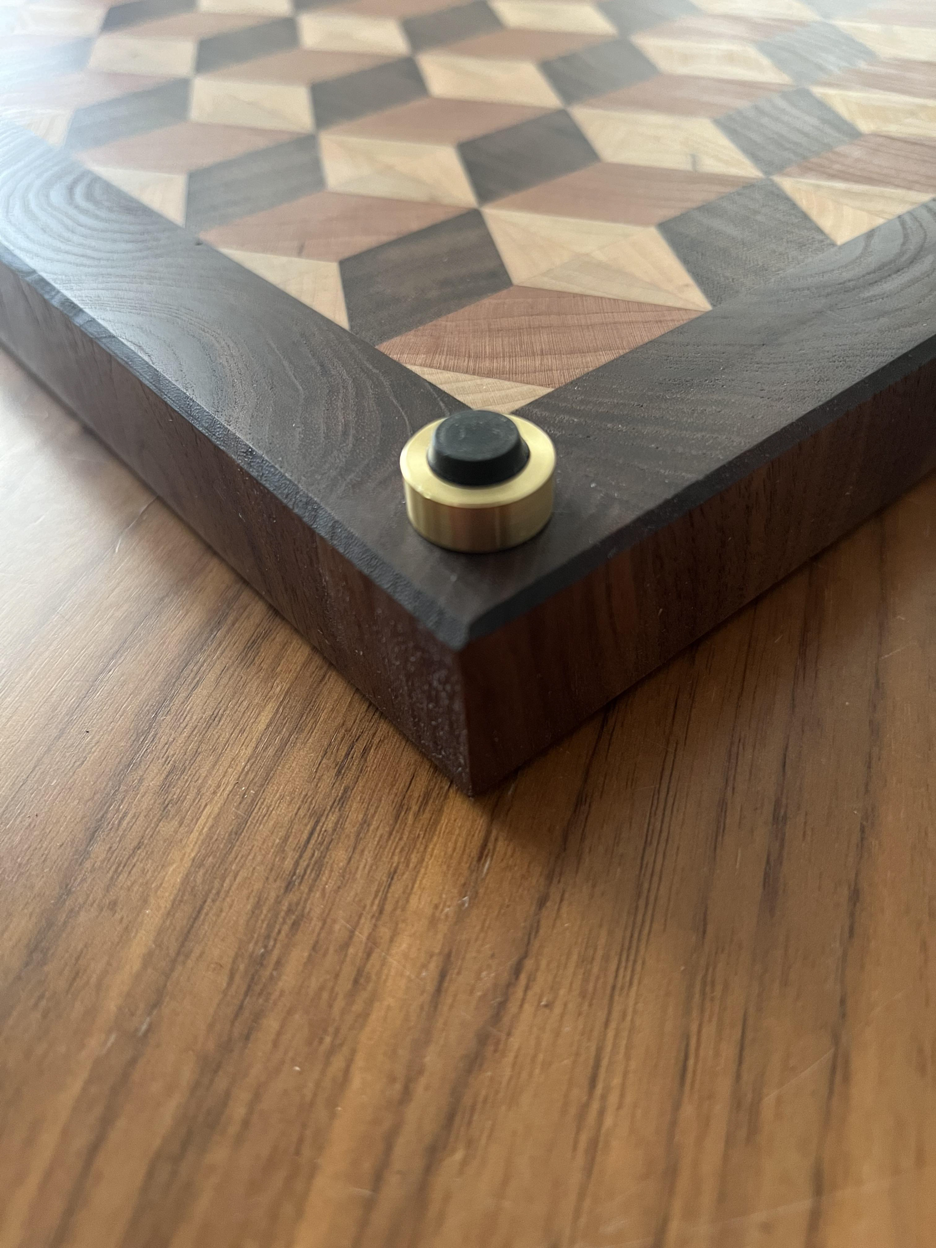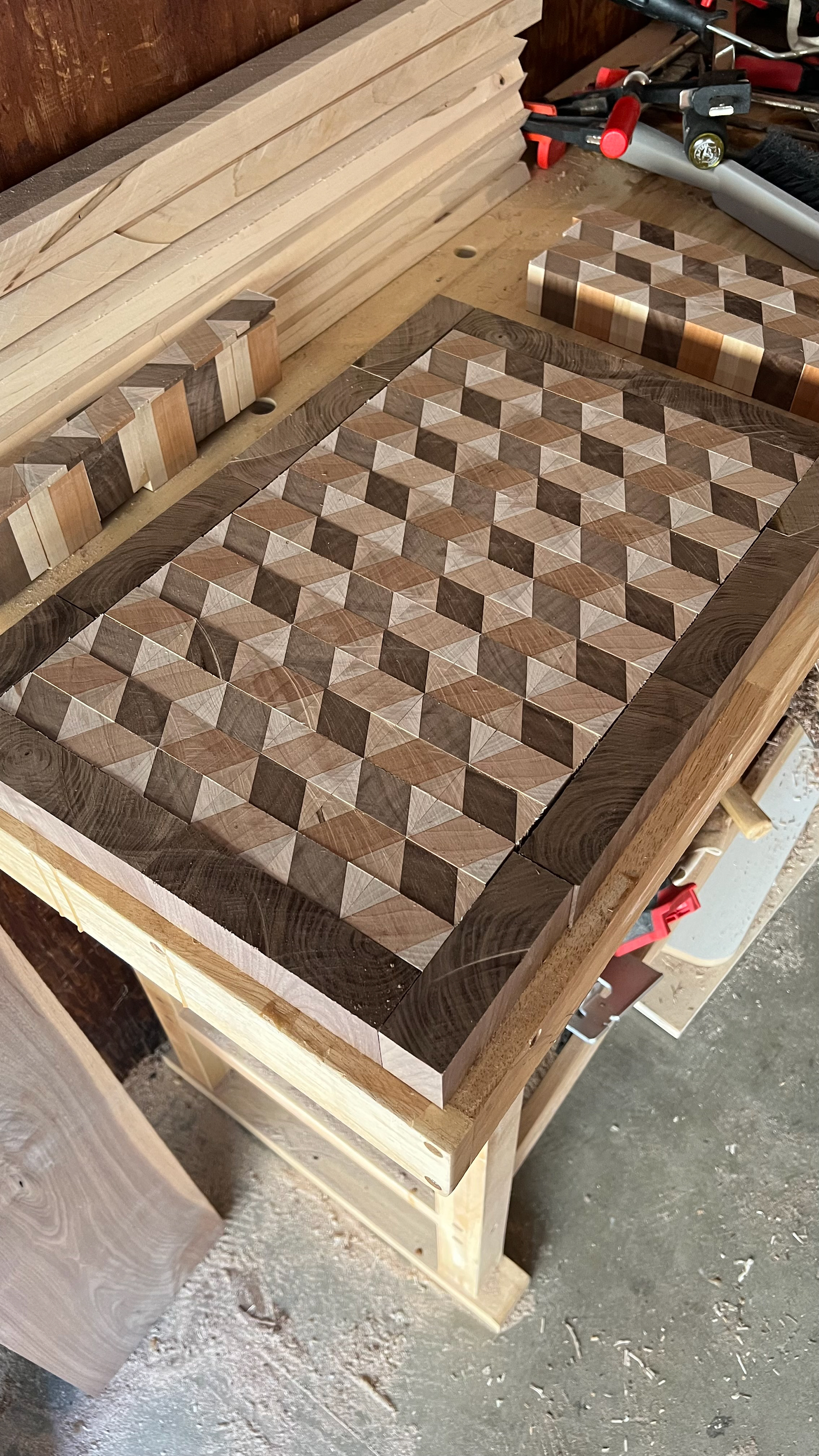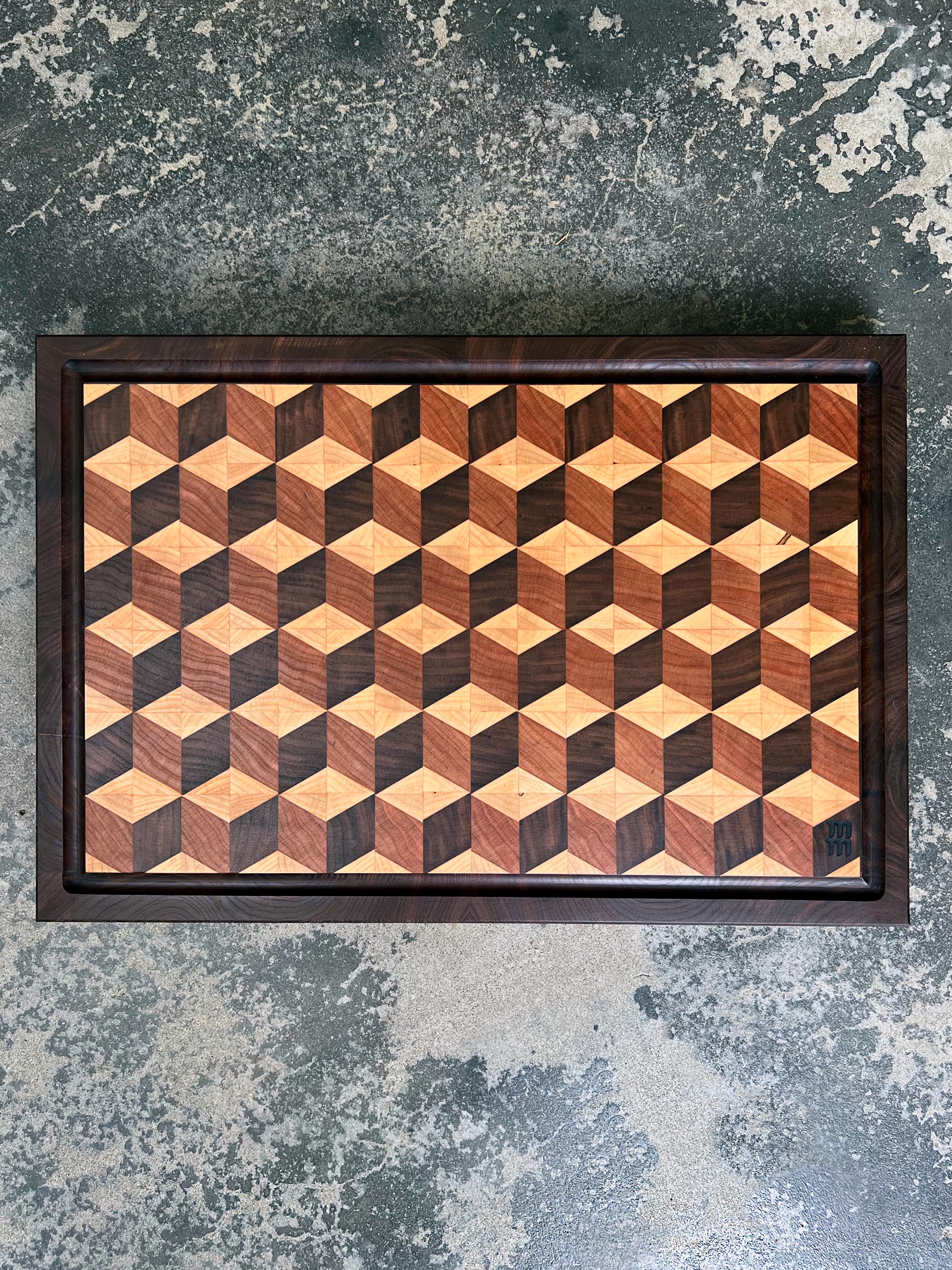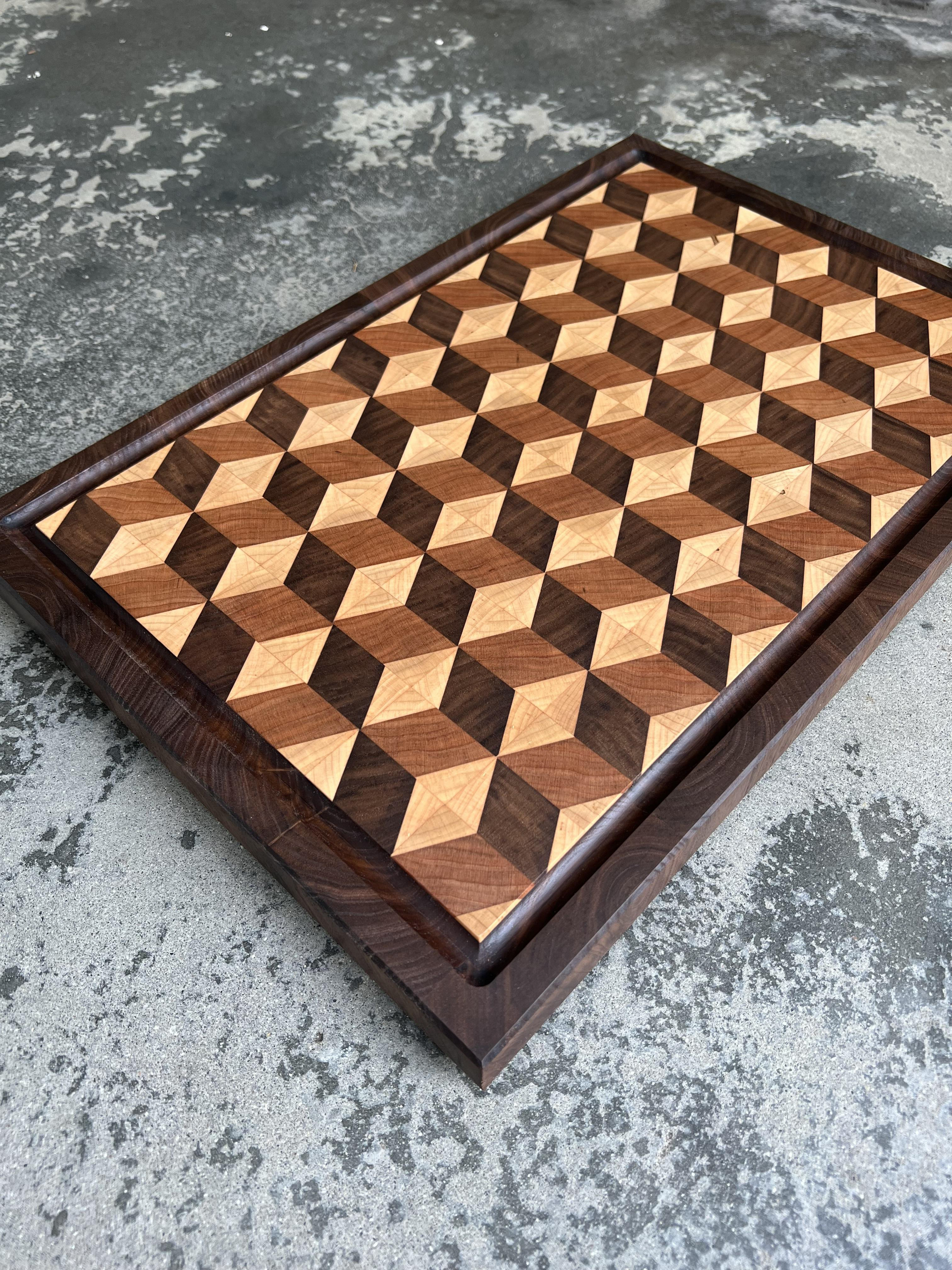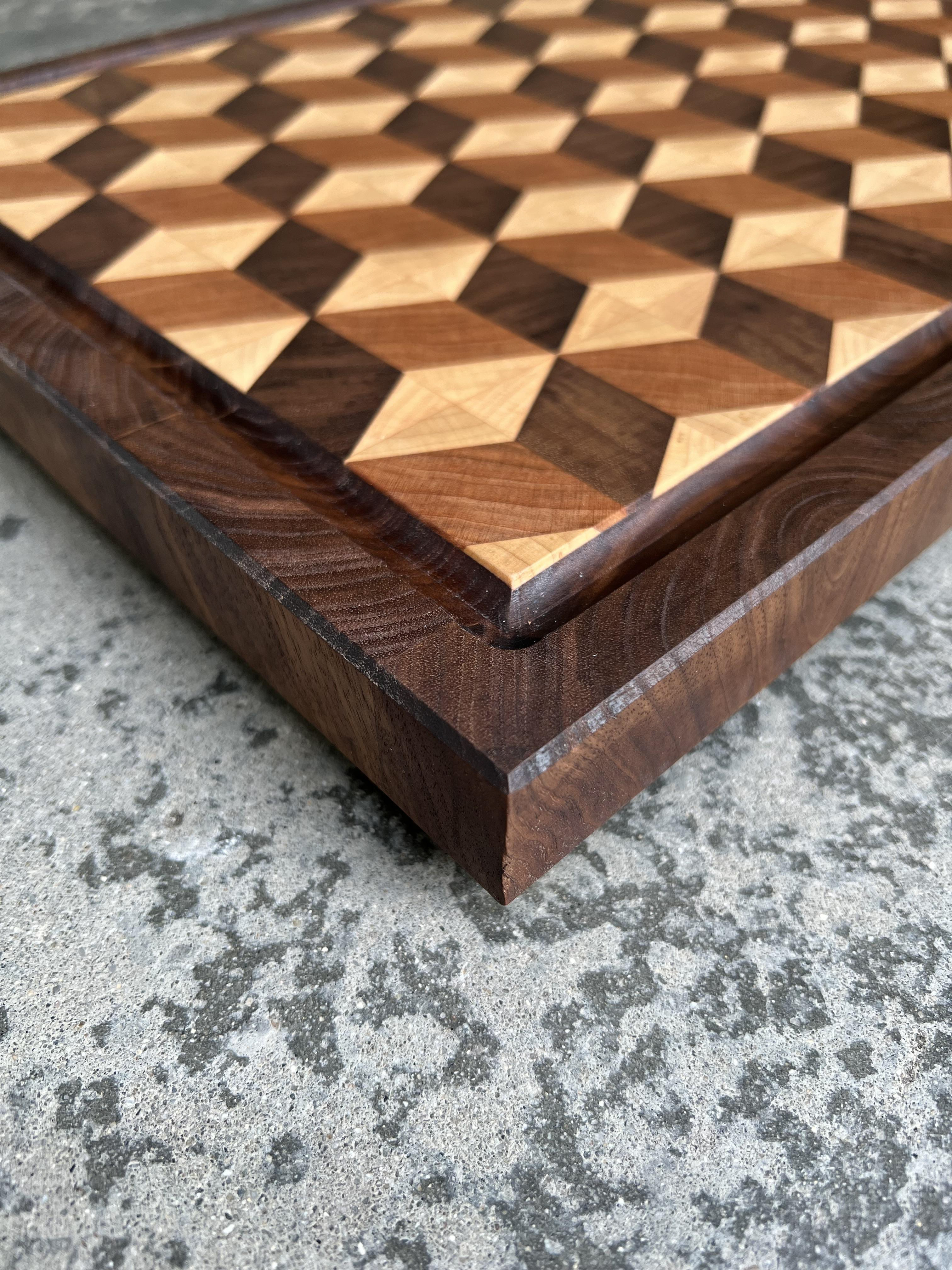 ISOMETRIC END GRAIN CUTTING BOARD MADE WITH MAPLE, WALNUT, AND CHERRY LAMINATIONS.