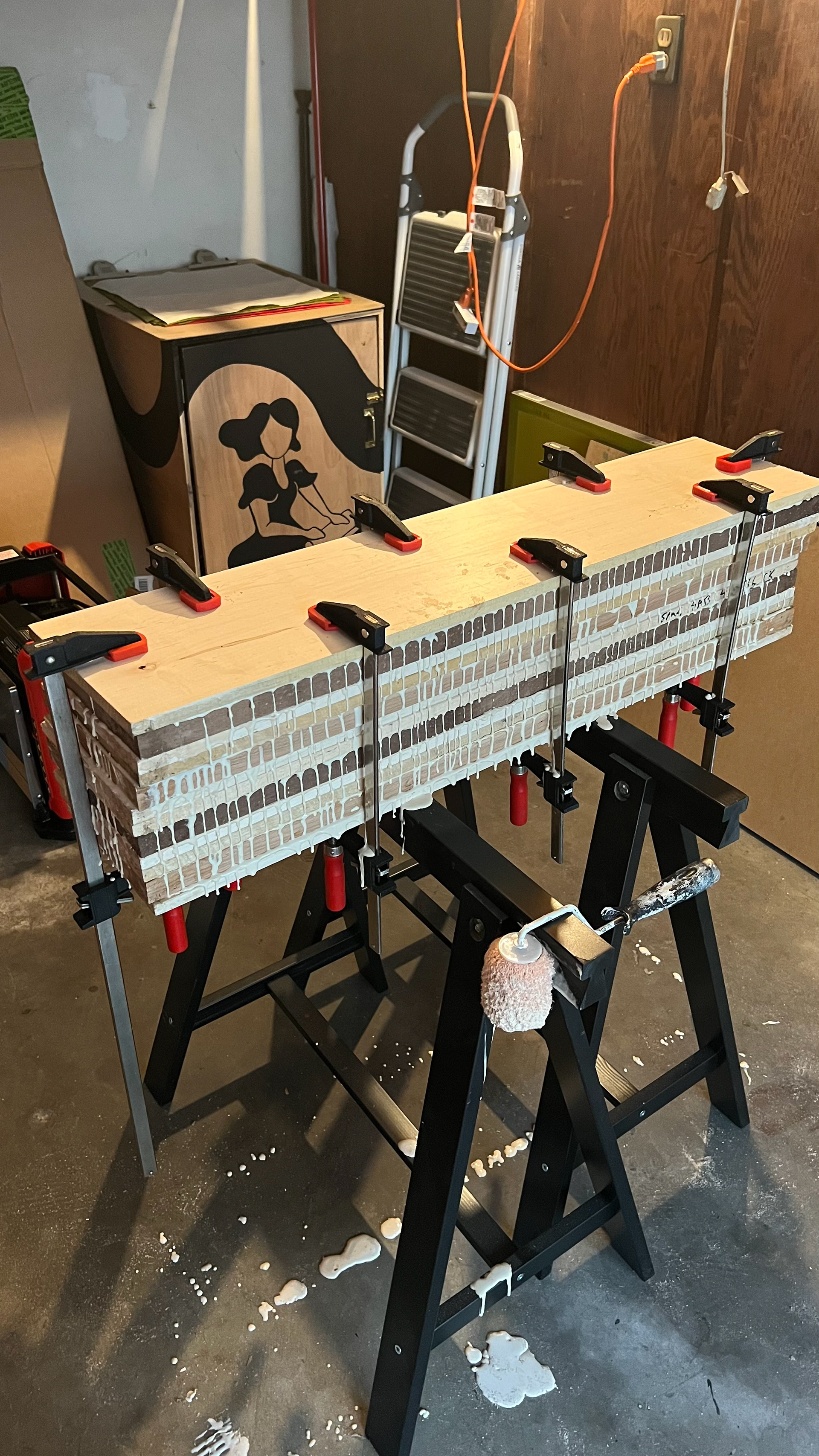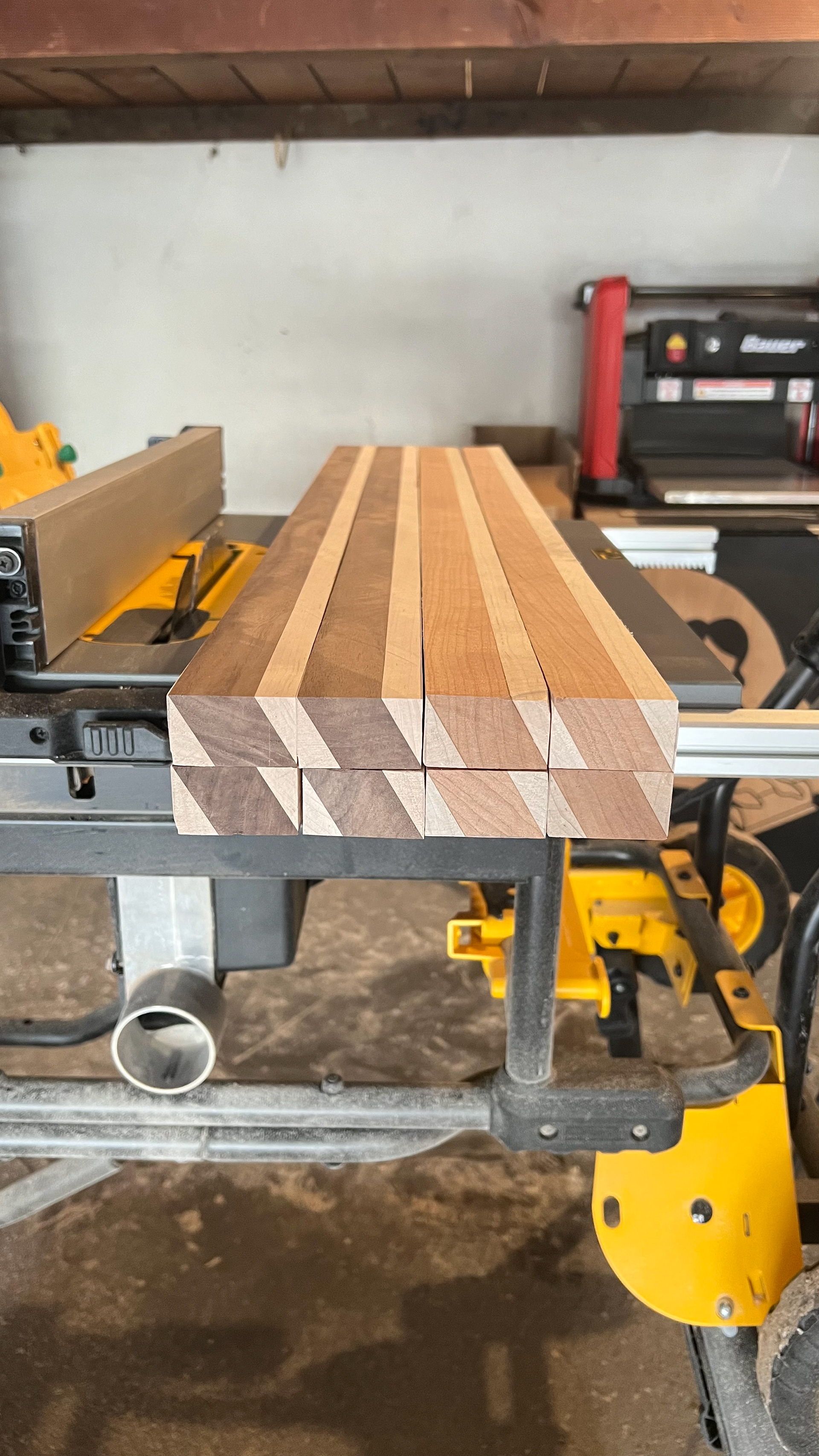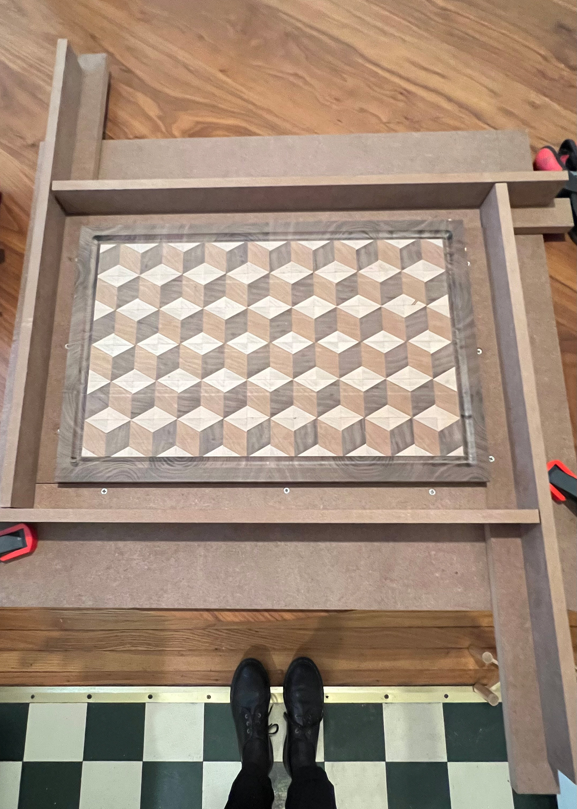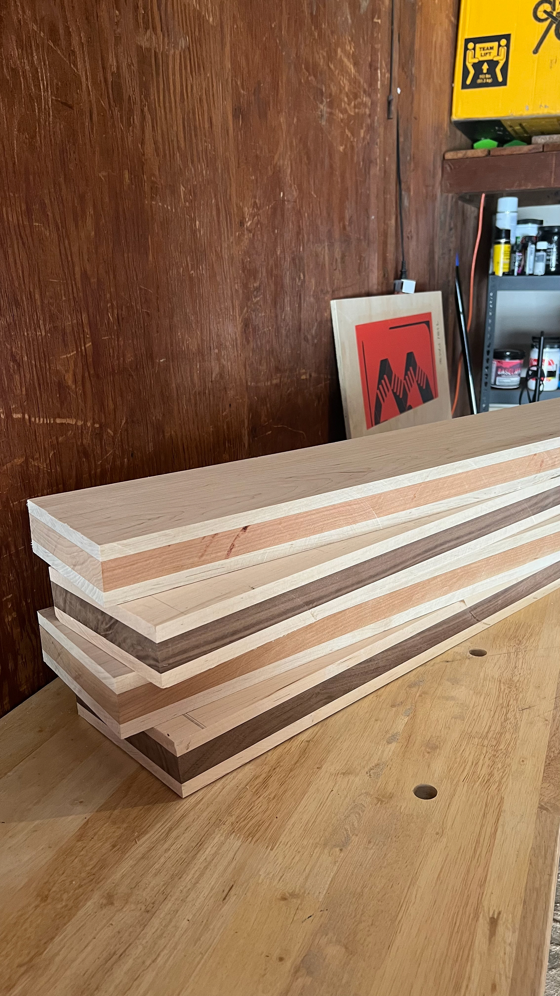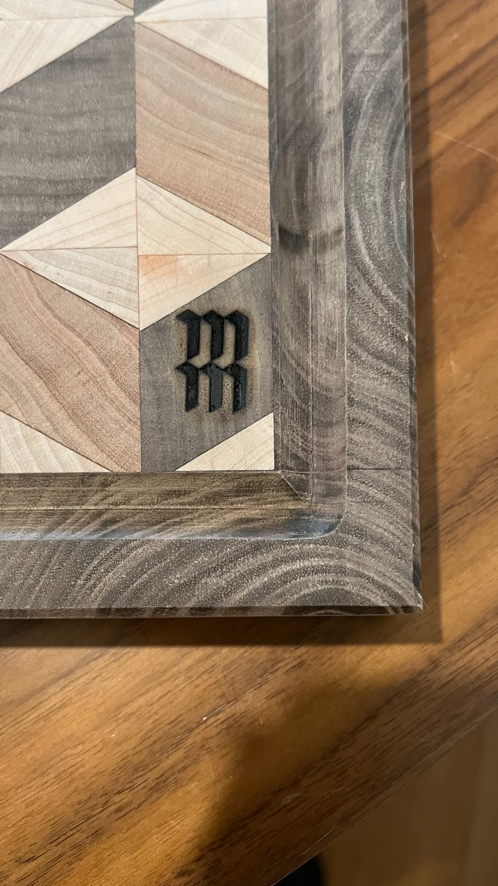 ISOMETRIC END GRAIN CUTTING BOARD MADE WITH MAPLE, WALNUT, AND CHERRY LAMINATIONS.