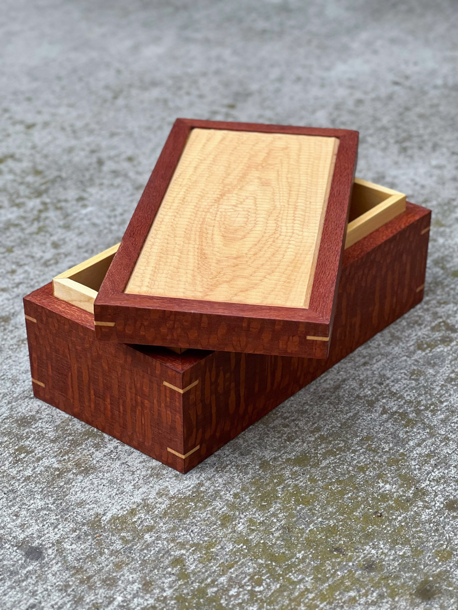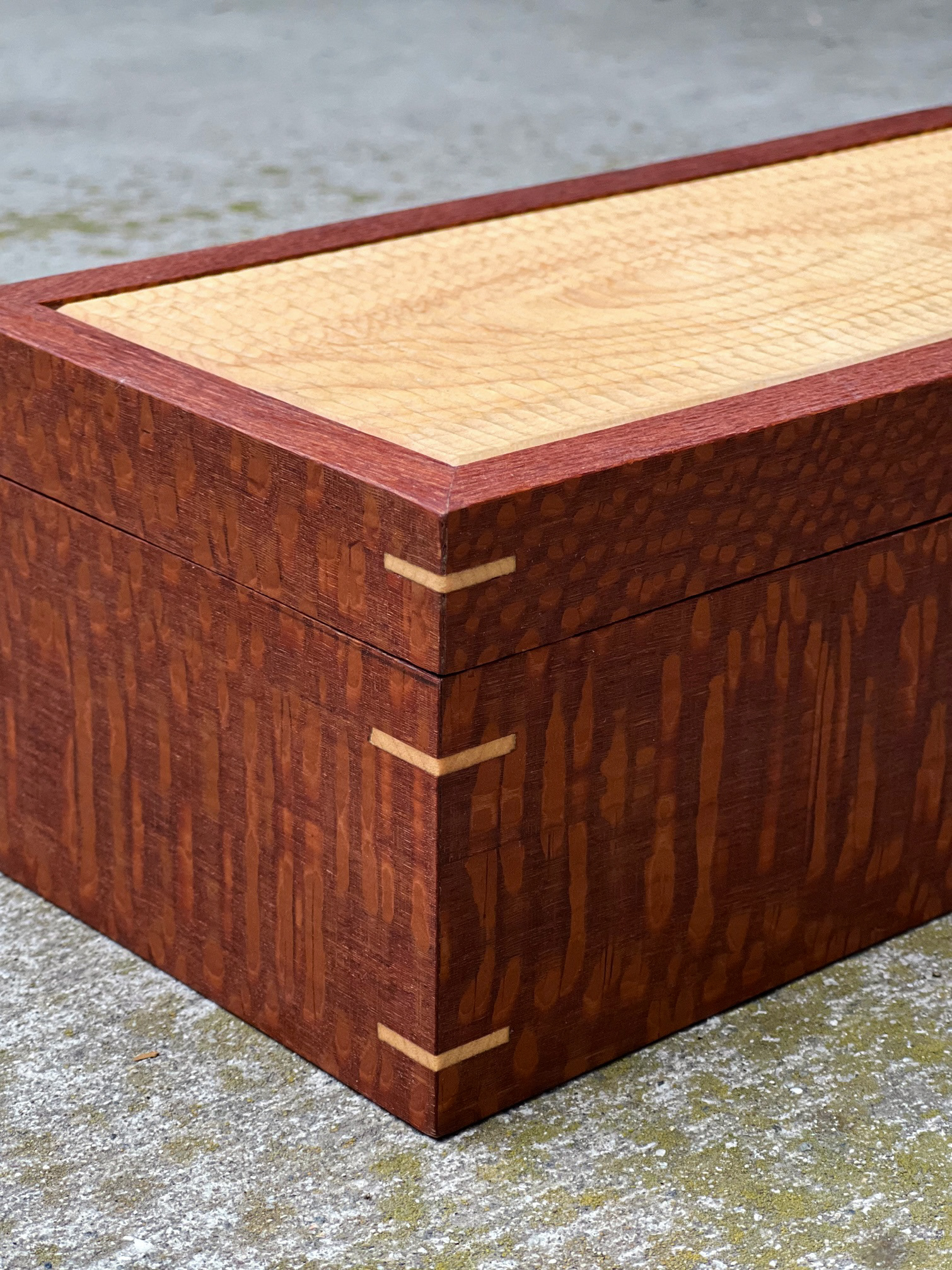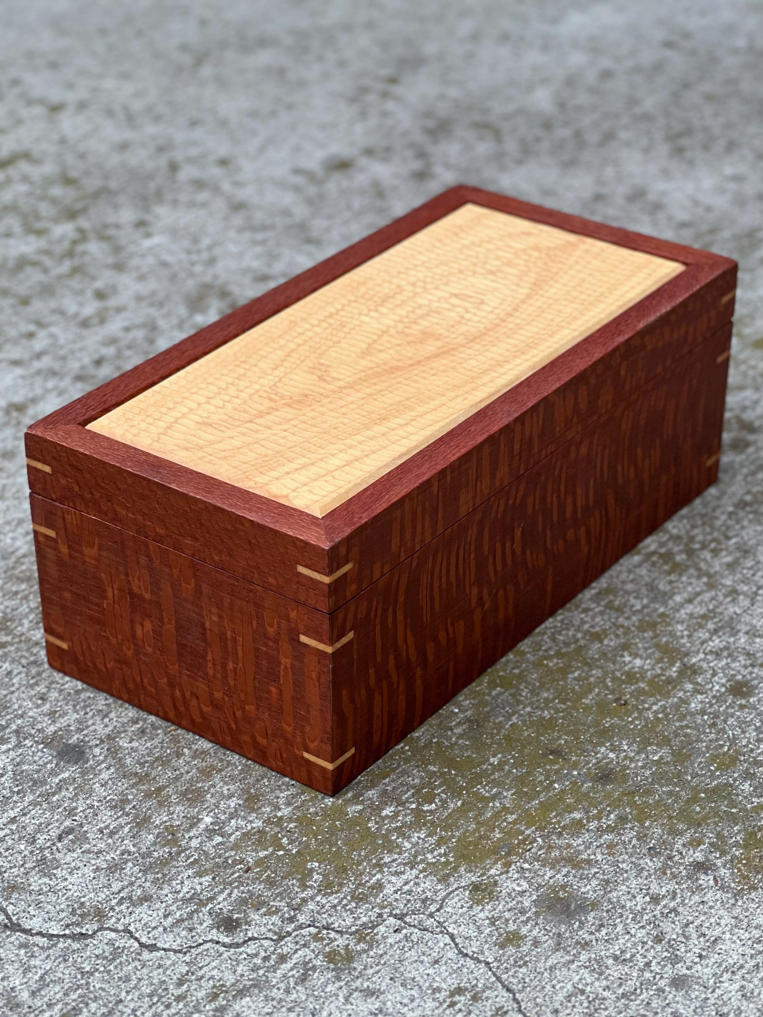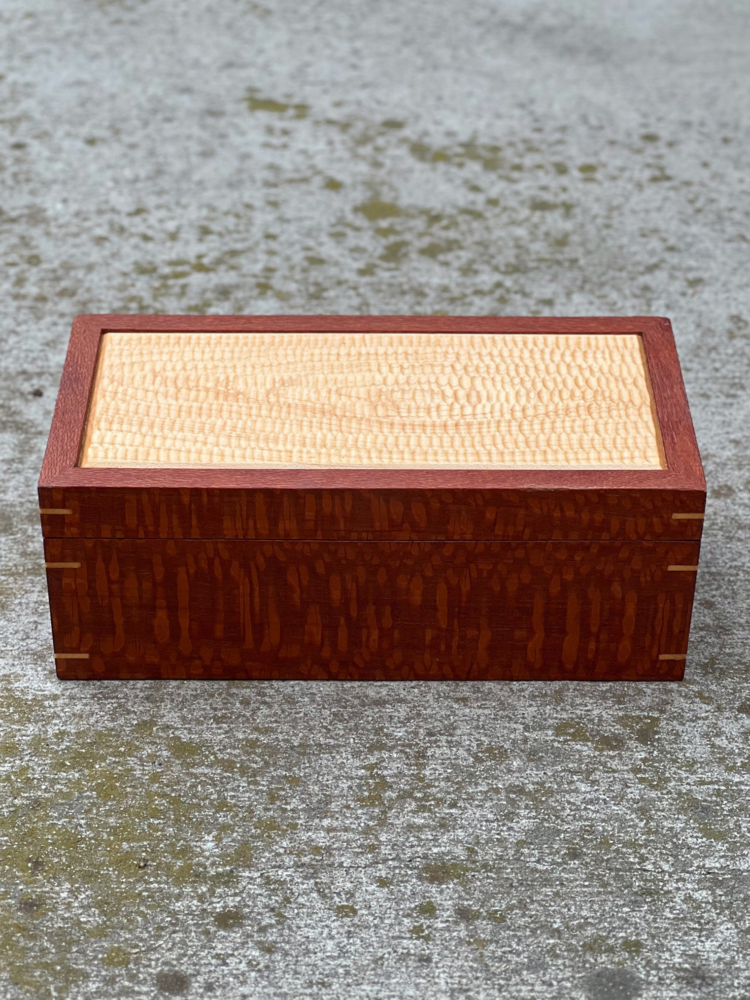 LEOPARD WOOD AND MAPLE BOX WITH HAND CARVED LID