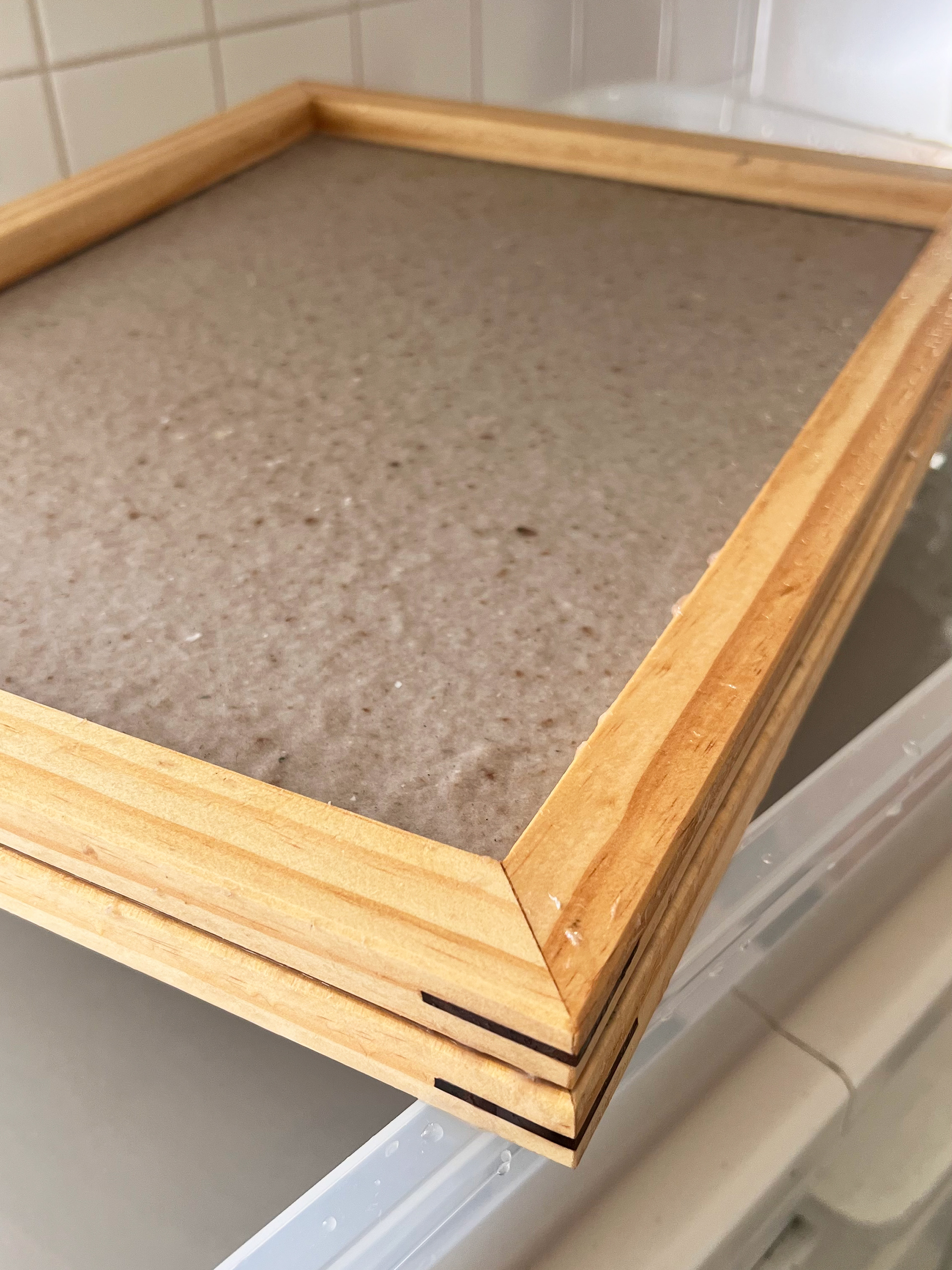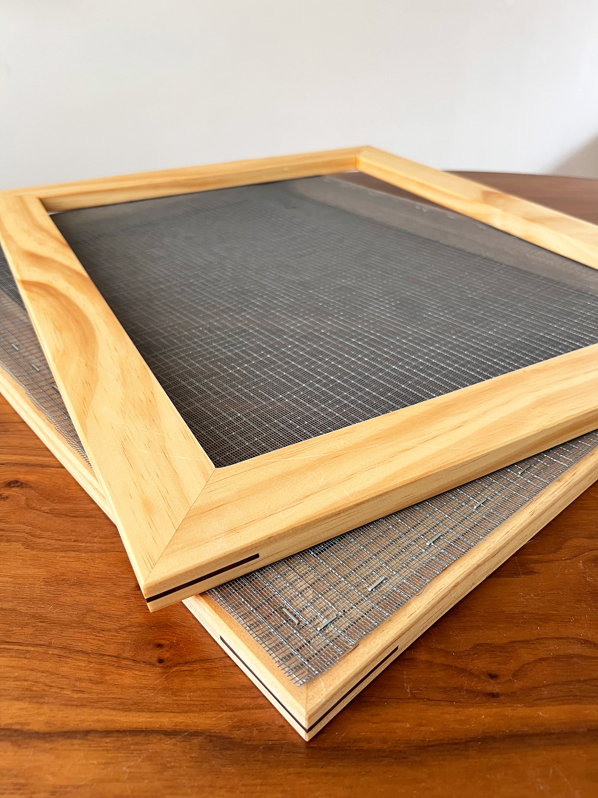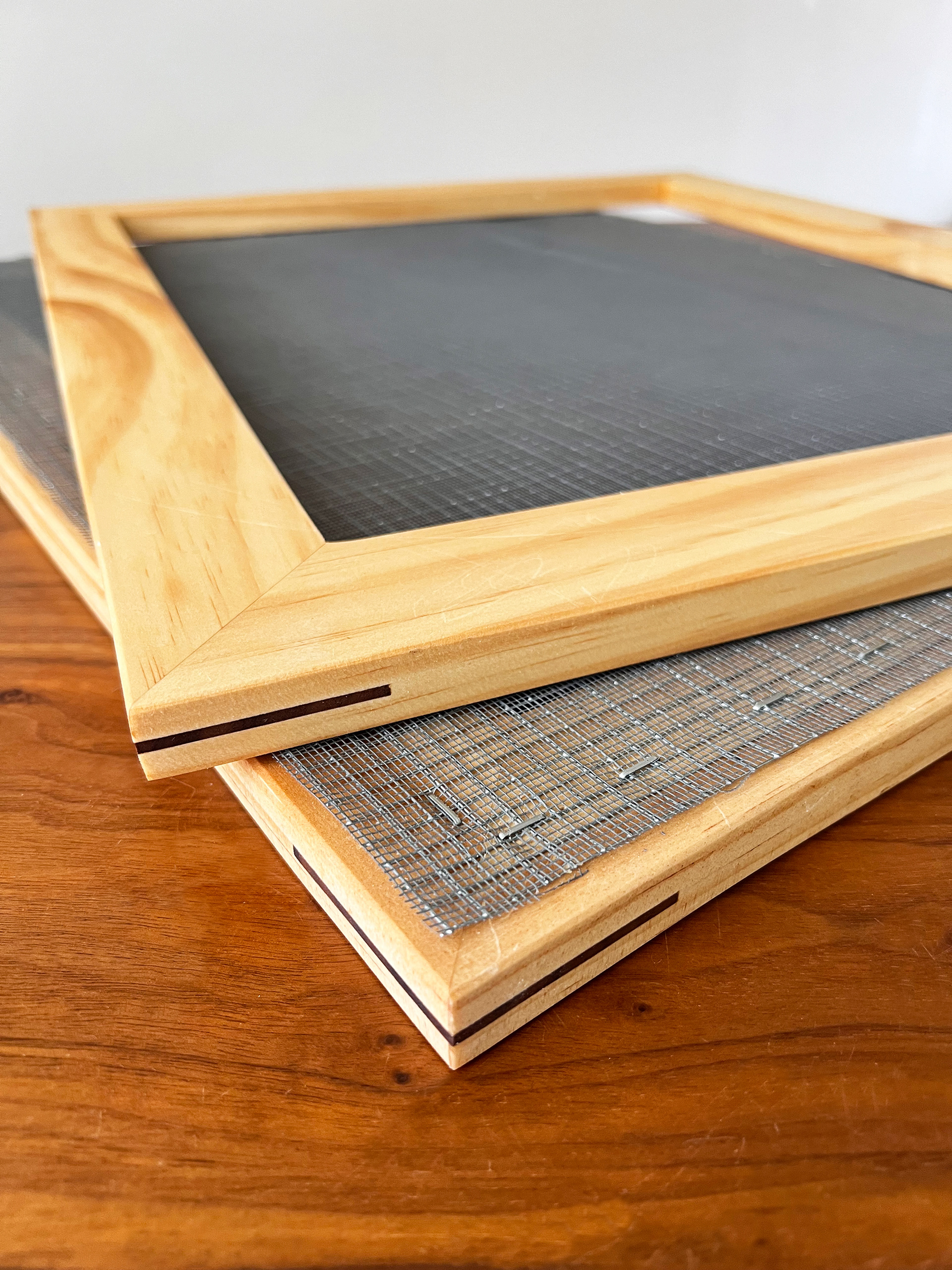 MOULD AND DECKLE MADE FROM PINE WITH WALNUT SPLINES. USED FOR PAPER MAKING FOR BLOCK PRINTING PROJECTS.