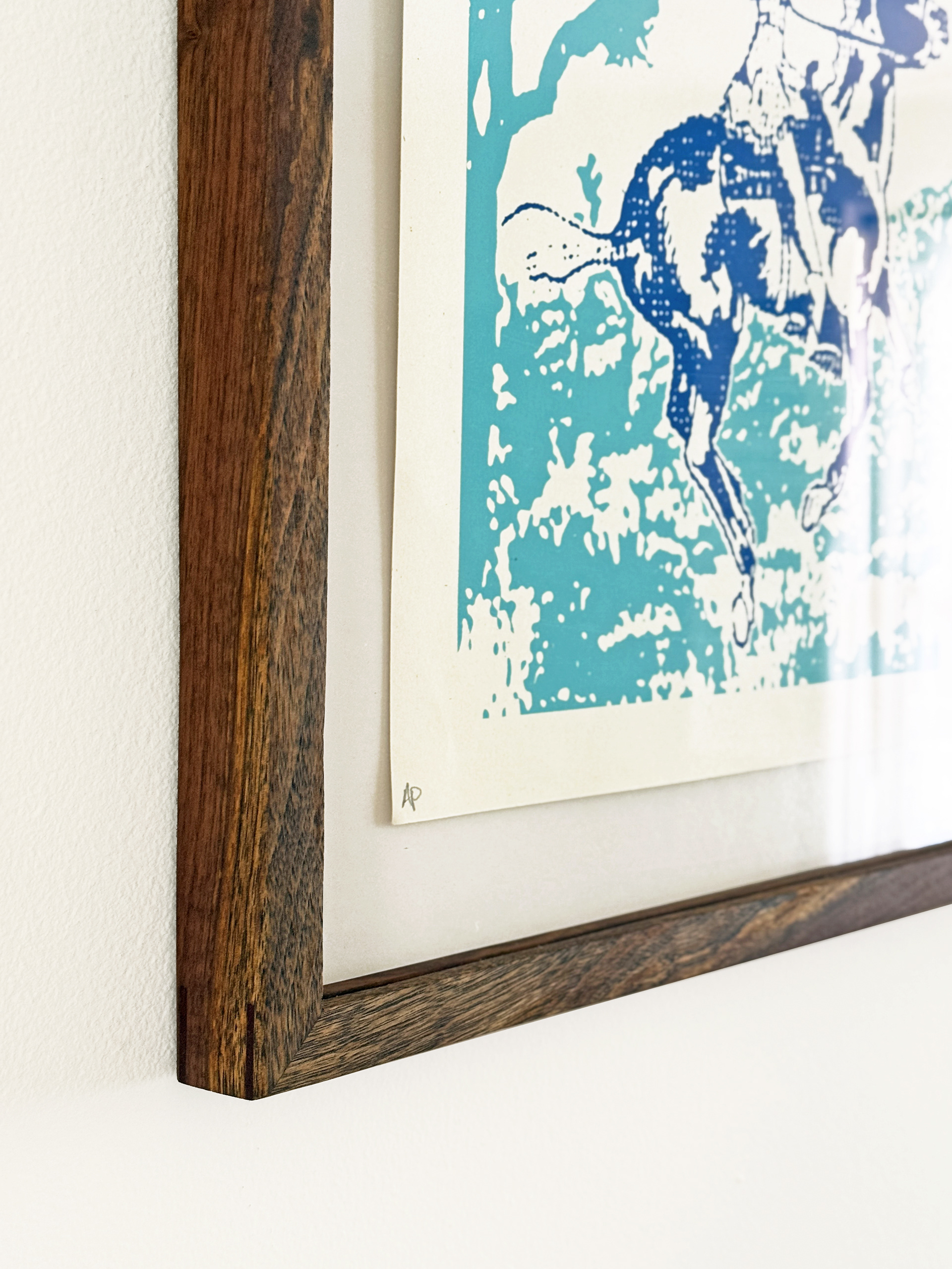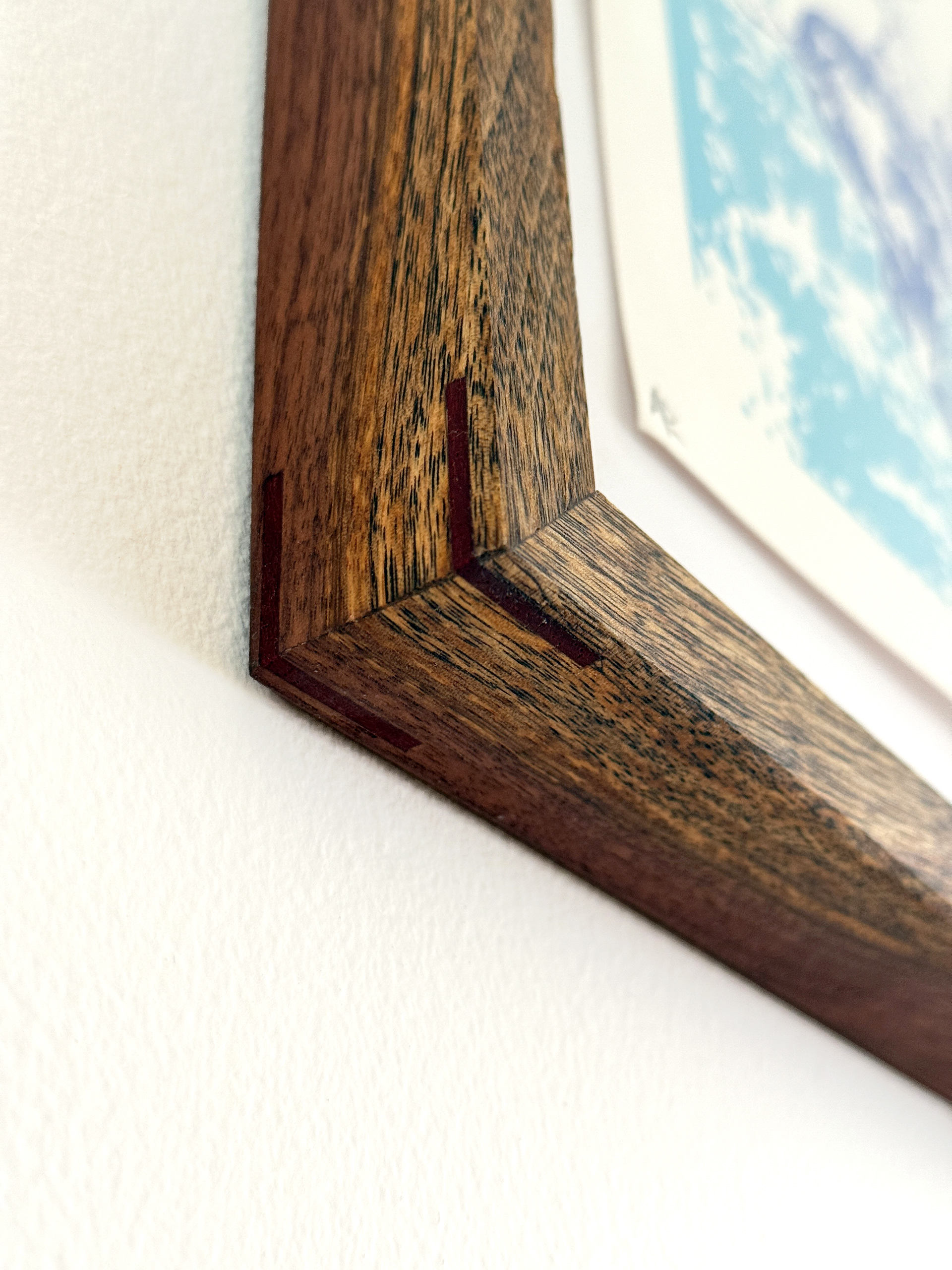 SPALTED WALNUT ARCHIVAL FRAME WITH PADAUK SPLINES.