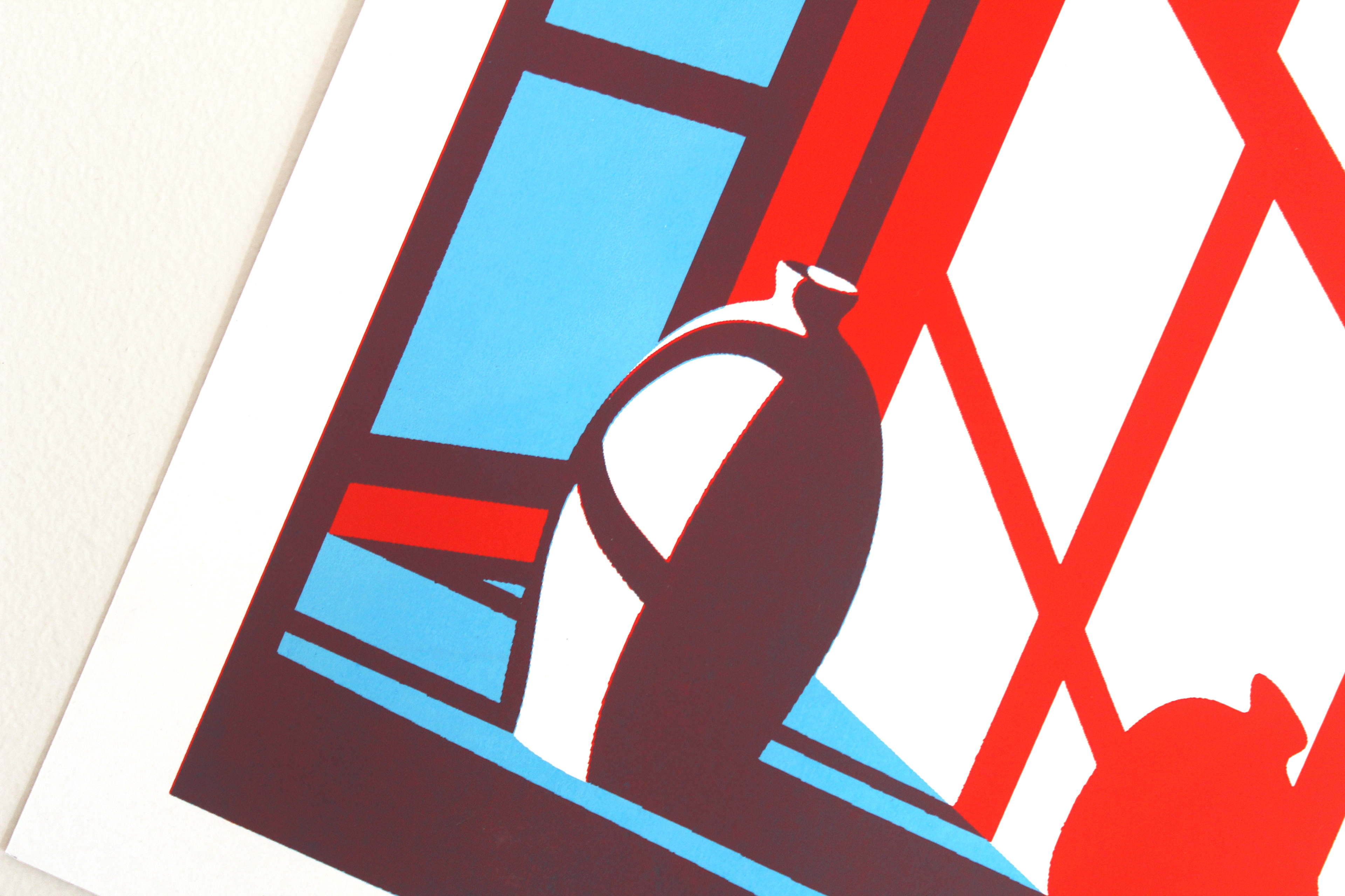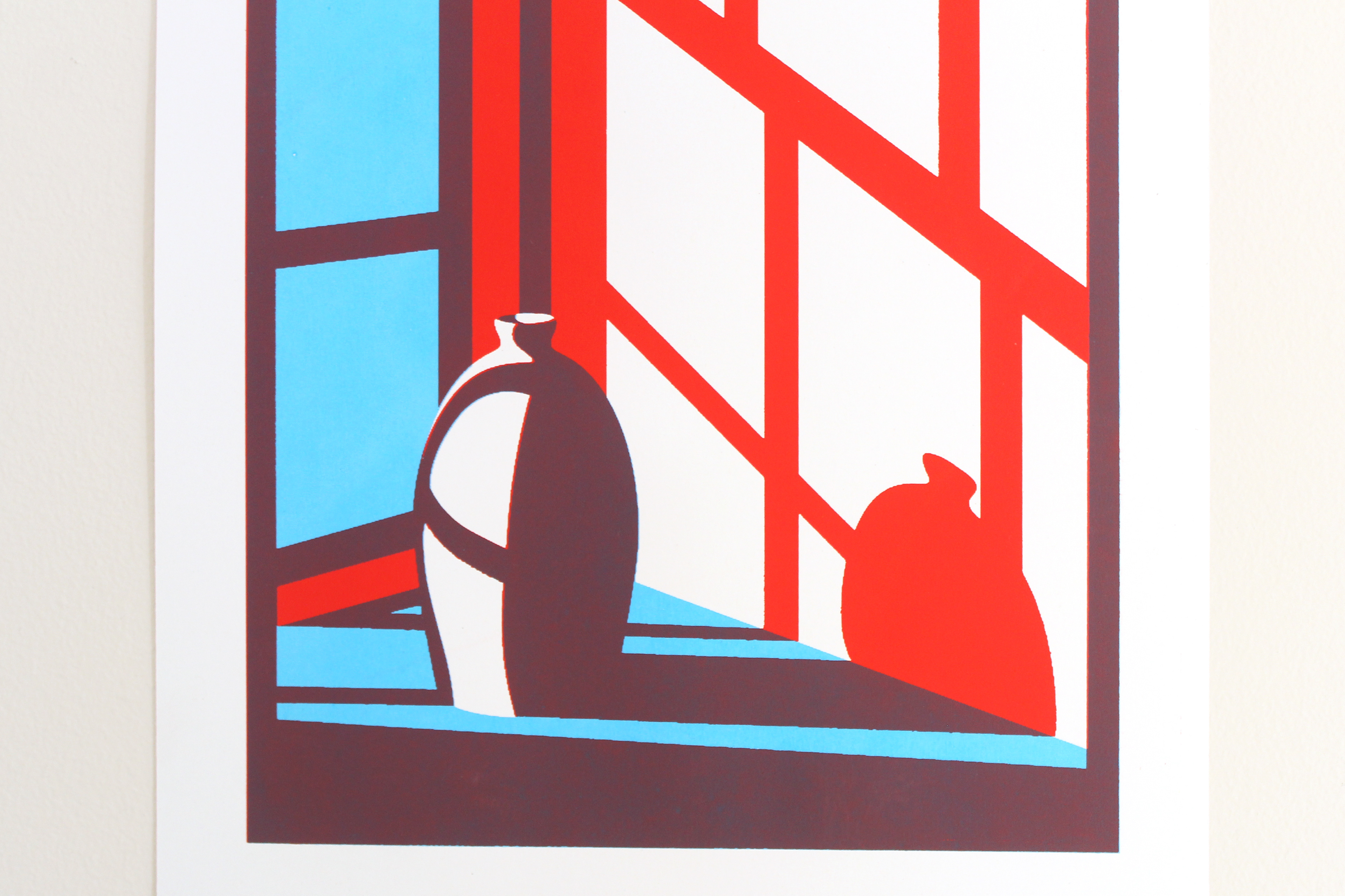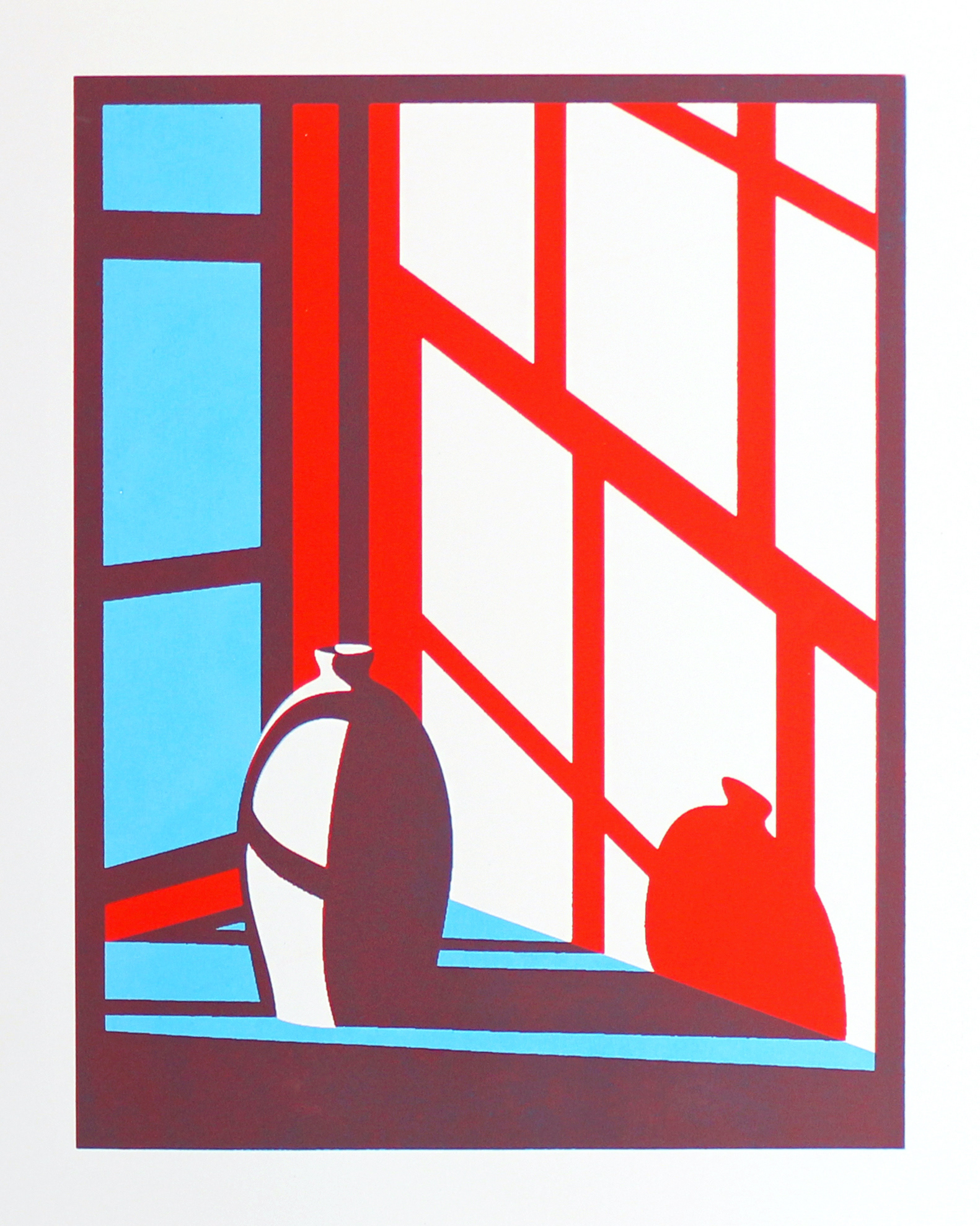 VASE IS A TWO-COLOR PROCESS OVERPRINT SCREEN PRINTED IN A HOME STUDIO. RED AND BLUE PRIMARY COLORS WERE MIXED WITH TRANSPARENCY TO CREATE A THIRD OVERLAPPING COLOR.