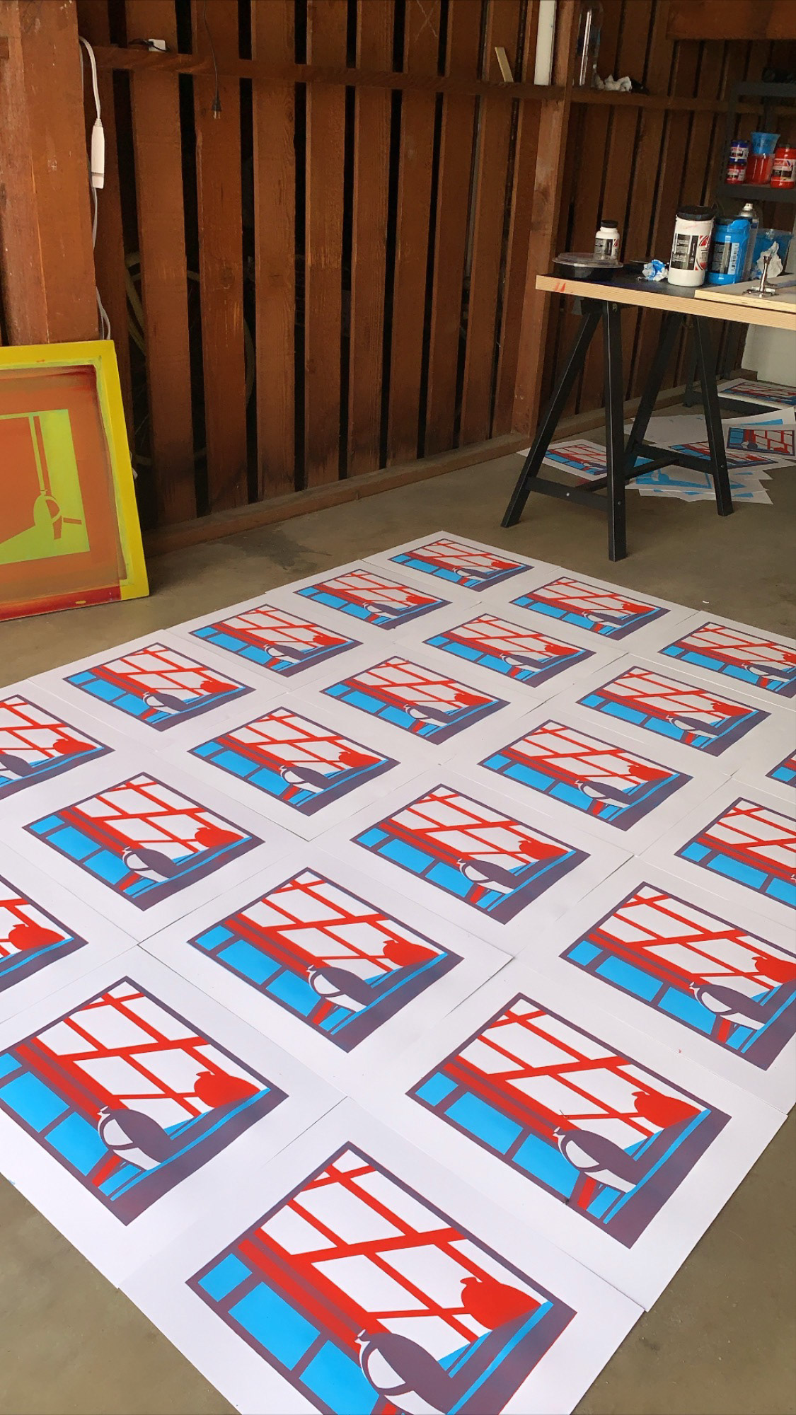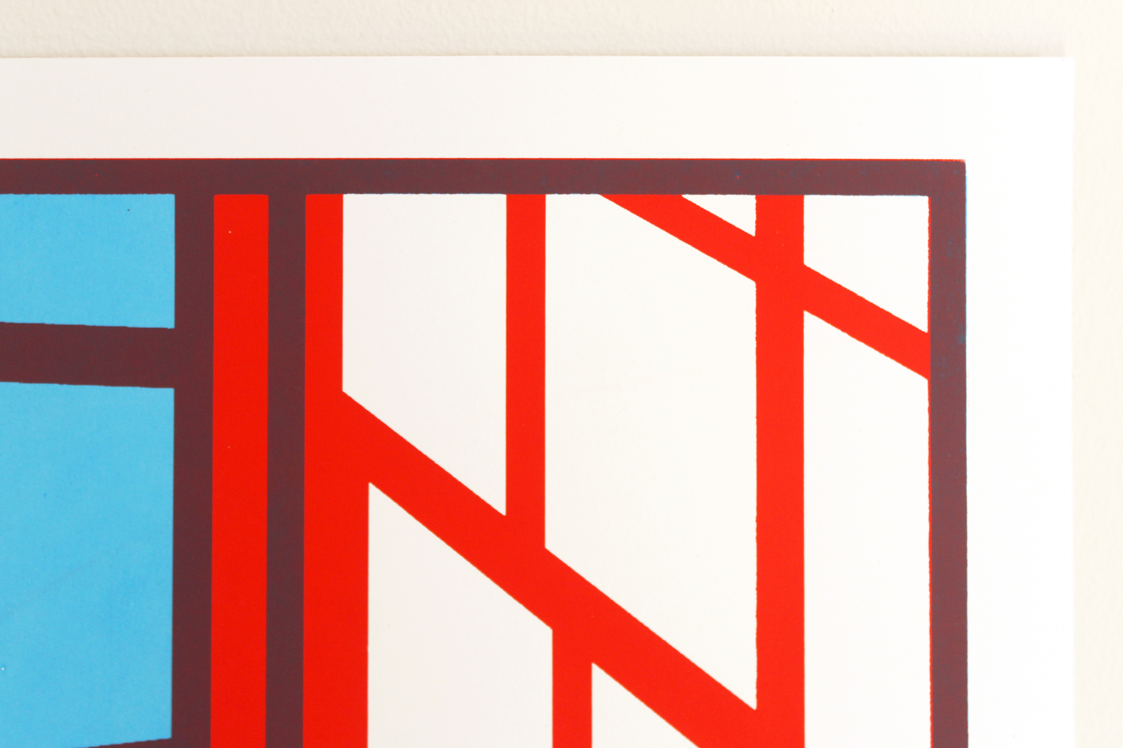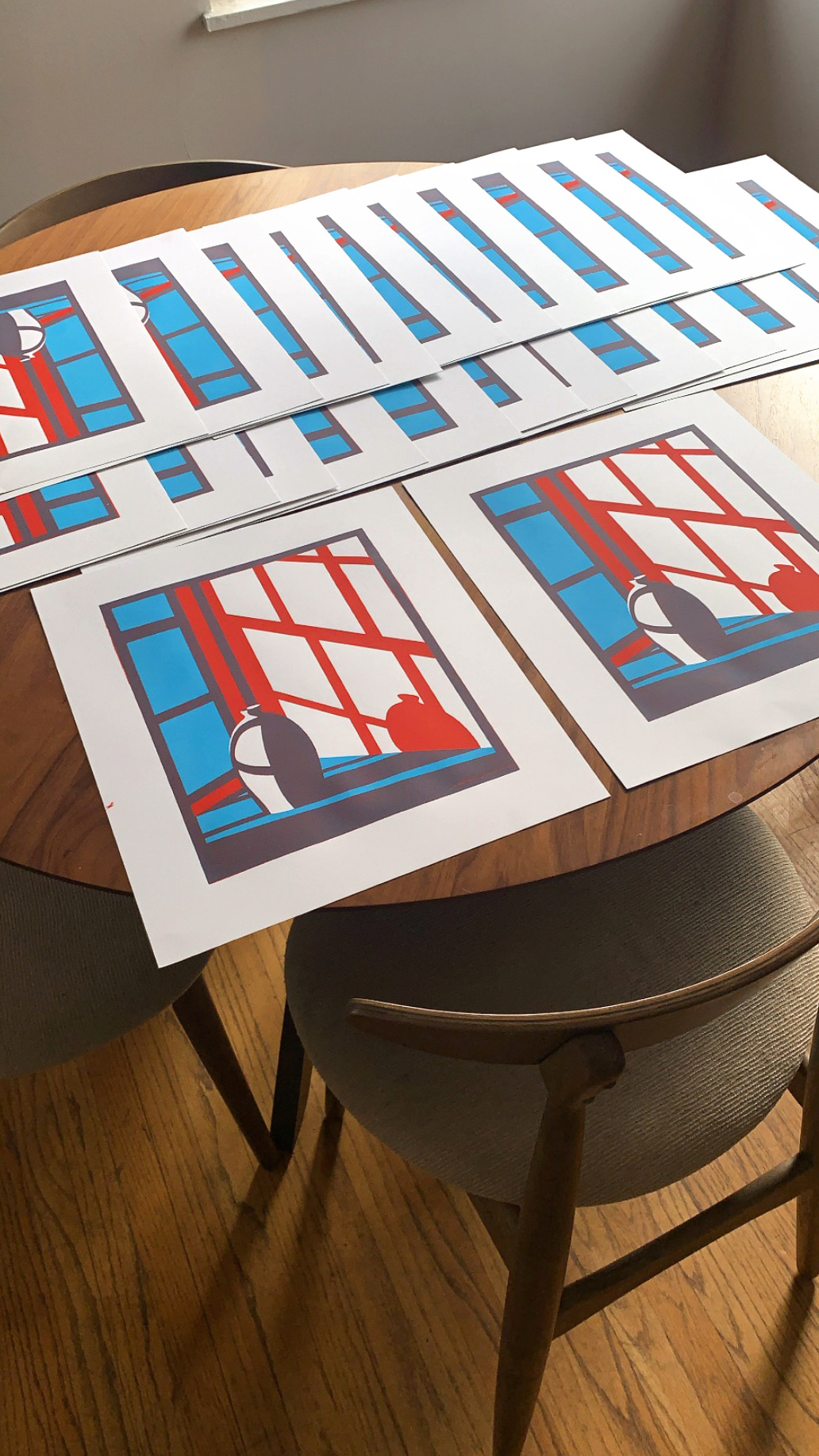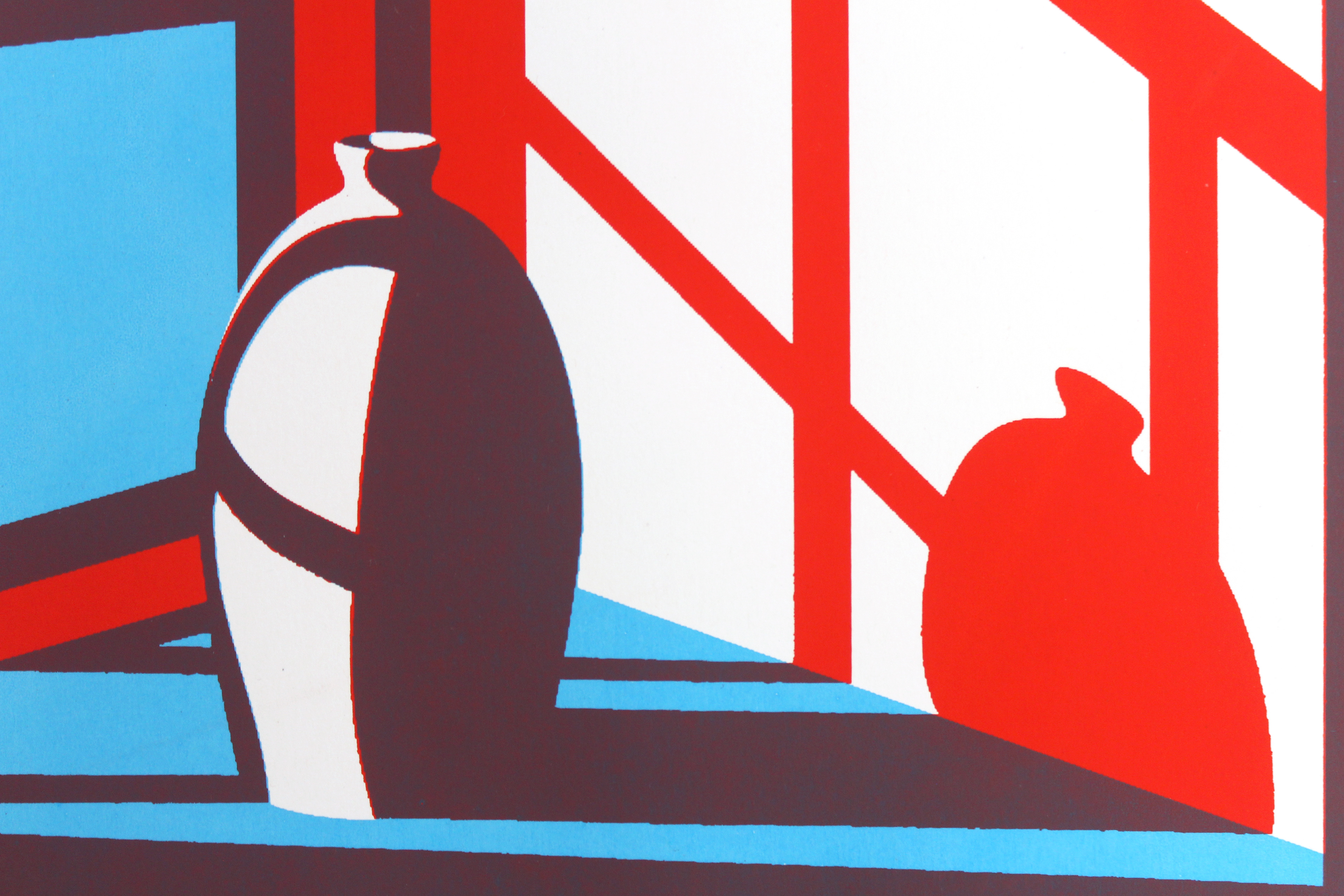 VASE IS A TWO-COLOR PROCESS OVERPRINT SCREEN PRINTED IN A HOME STUDIO. RED AND BLUE PRIMARY COLORS WERE MIXED WITH TRANSPARENCY TO CREATE A THIRD OVERLAPPING COLOR.