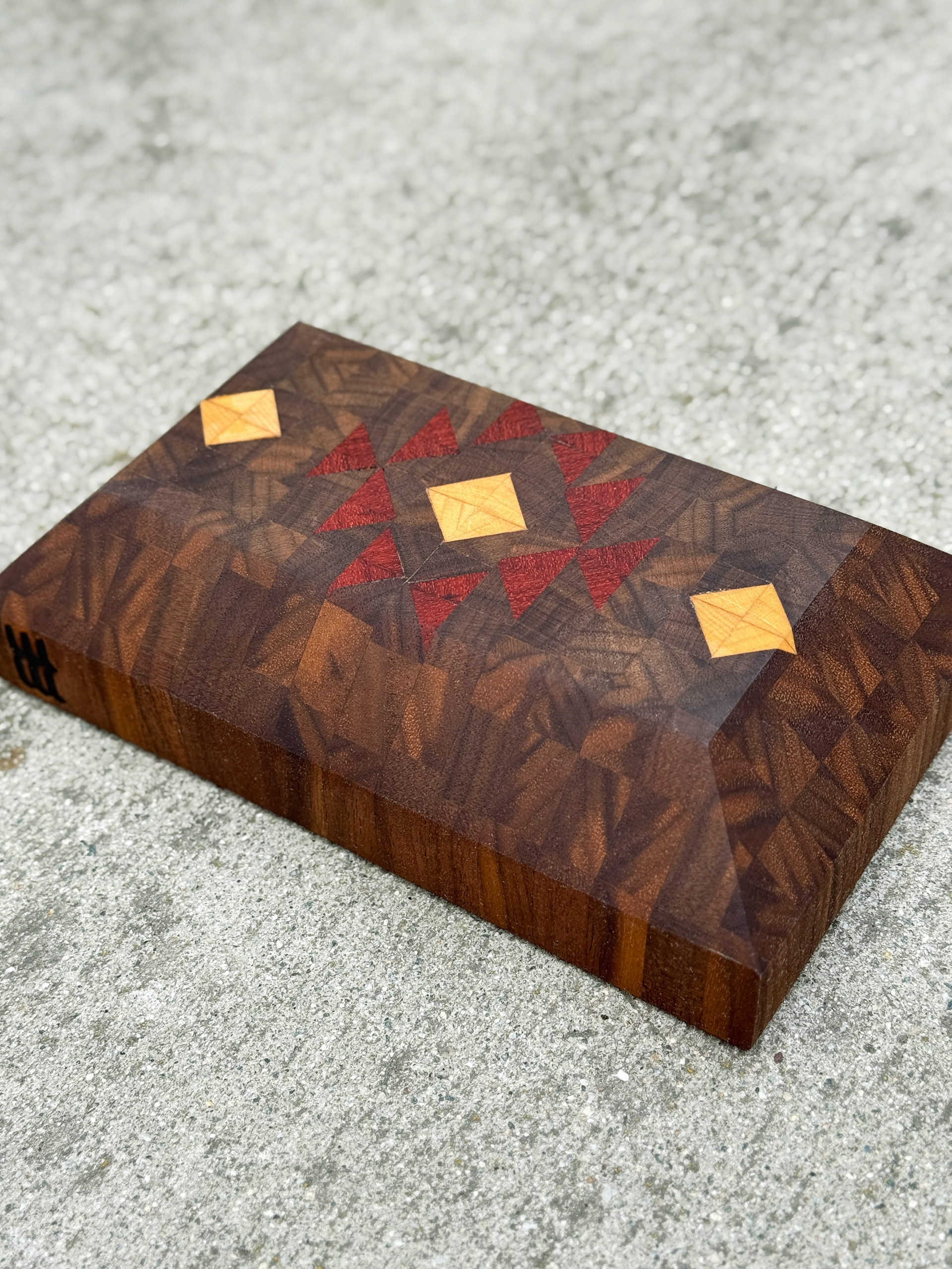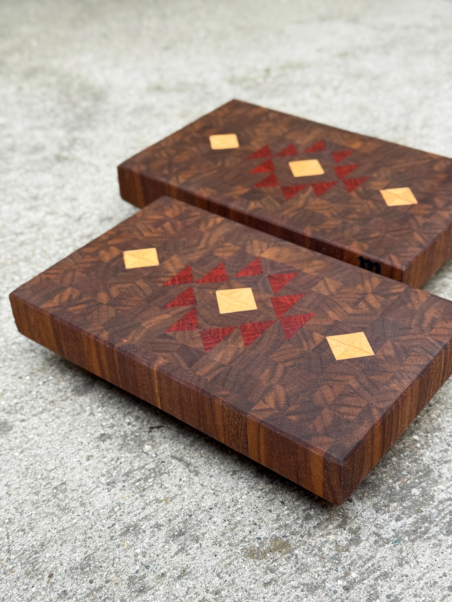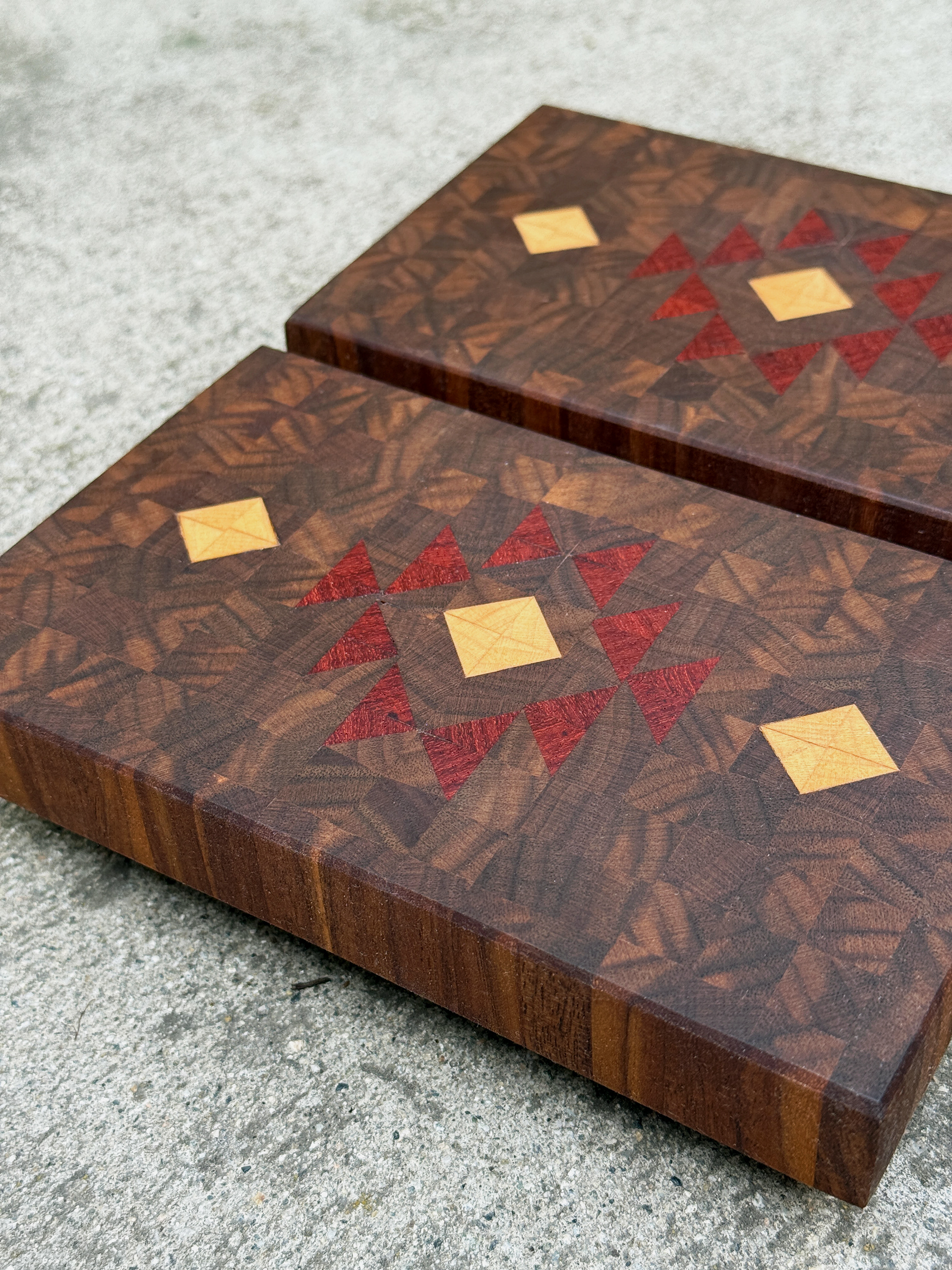 WESTERN END GRAINÂ GARNISH BOARDS MADE FROM WALNUT, PADAUK, AND HARD MAPLE.